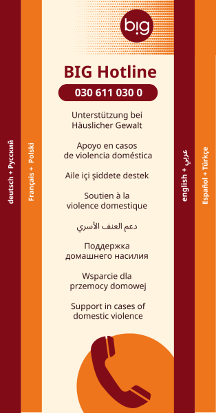 Unser Flyer informiert in verschieden Sprachen über die kostenlosen Hilfsangebote der BIG Hotline.